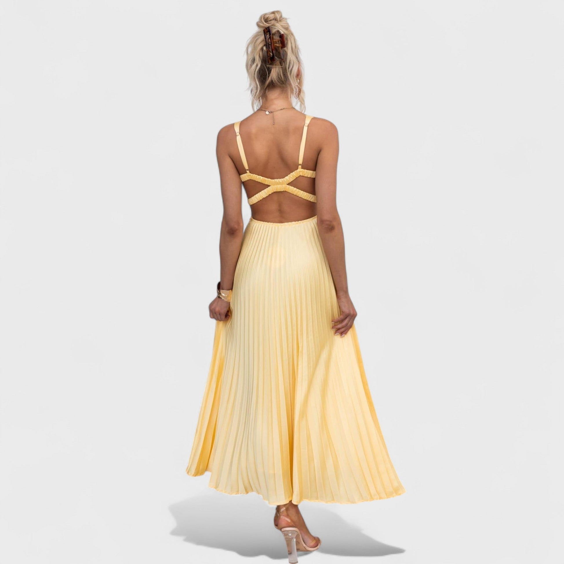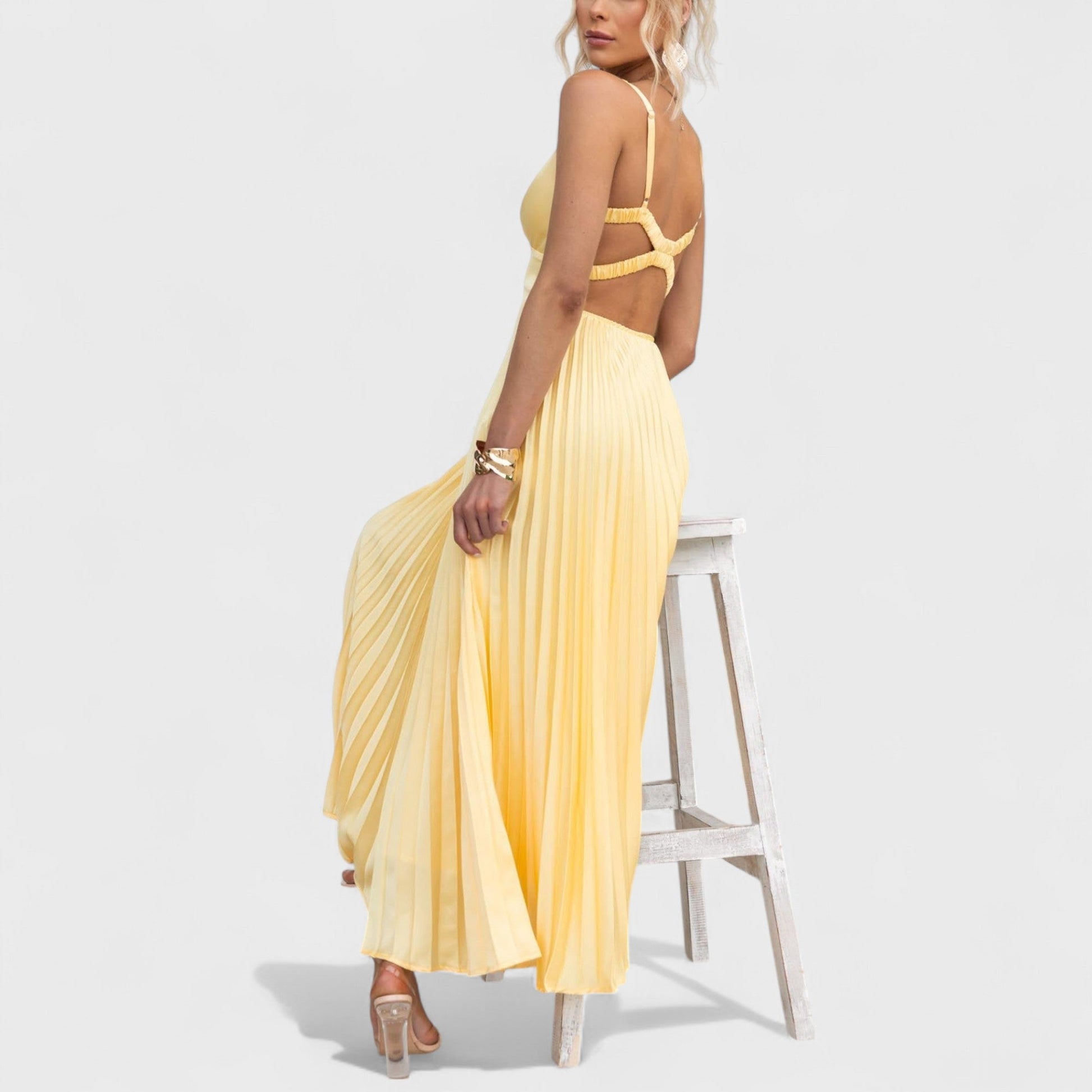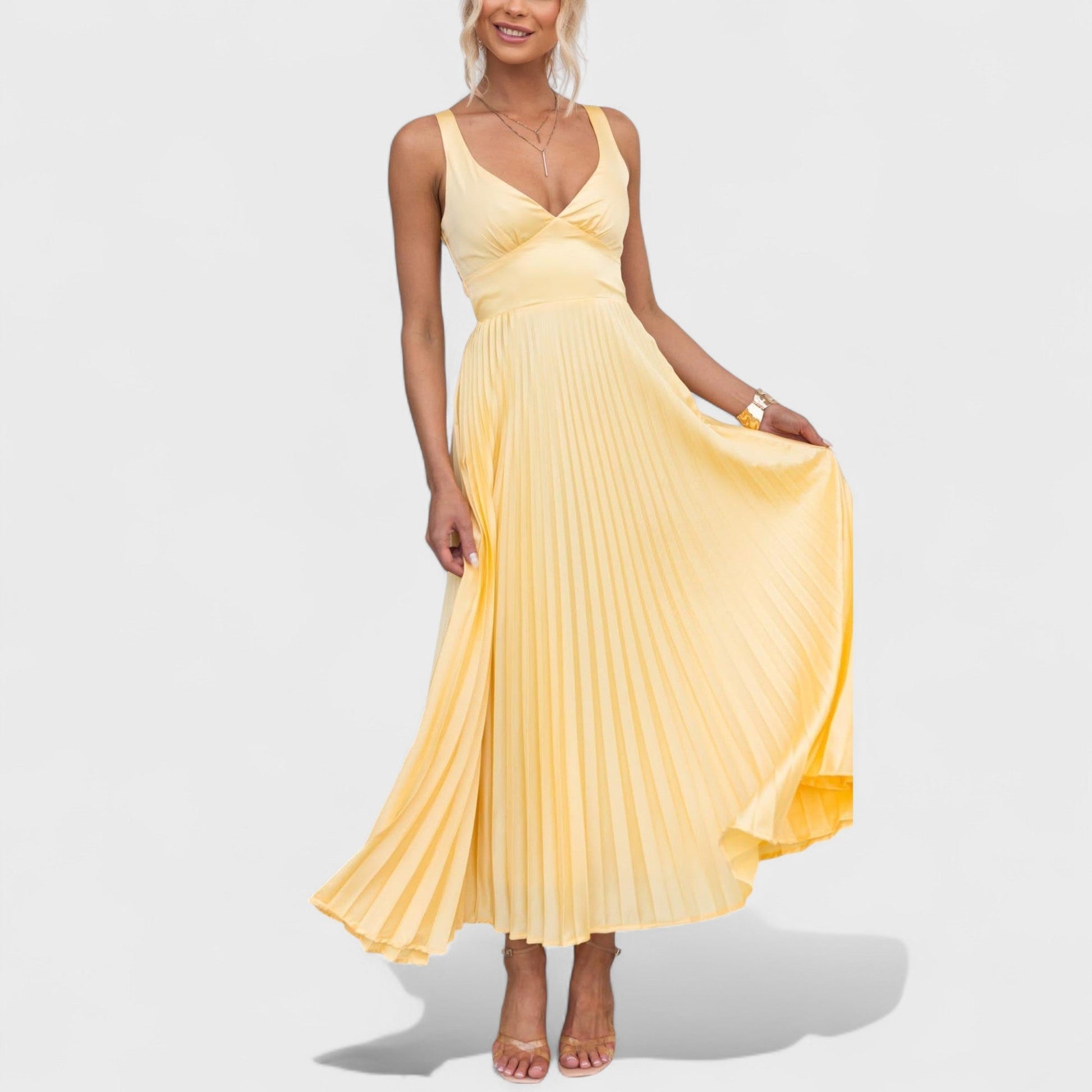 Šaty Marie vynikajú jemným plisovaním, ktoré dodáva šatám ľahkosť a elegantný pohyb. Výstrih do V zvýrazňuje dekolt a pridáva šatám sofistikovaný nádych. Vďaka maxi dĺžke pôsobia veľmi vznešene a sú ideálnou voľbou pre slávnostné príležitosti aj letné večery v meste.